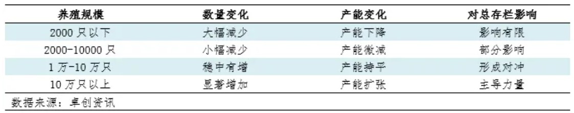 近年来,蛋鸡养殖行业规模化进程持续提速。截至2025年末,万只以上规模养殖场占比已突破60%,近五年增值超一成半,10万只以上大型养殖场数量同比增长超一成,百万只级别超大规模养殖场已超过50家。而行业性亏损确实导致大量中小散户退出,2025年蛋鸡养殖户数减少接近一成,其中存栏2000只以下的小散户退出比例超一成半,但散户退出带来的产能缺口并未导致总存栏下降。