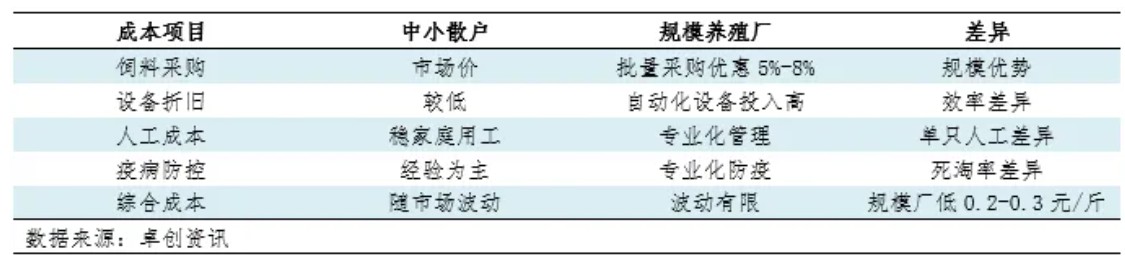 在行业亏损期,规模养殖场凭借0.2-0.3元/斤的成本优势,抗风险能力远超中小散户。这也是为何散户亏损退出时,规模企业反而逆势扩张的根本原因。其他诸如政策驱动着环保、防疫、土地等政策门槛持续提高,小散户合规成本进一步上升。而经济驱动着行业利润收窄后,成本优势成为核心竞争力,规模效应愈发重要。最后,技术驱动着智能化、数字化养殖技术的普及需要一定的规模门槛。预计未来三年,万只以上规模养殖场占比有望突破七成,十万只以上大型养殖场将成为行业主导力量。