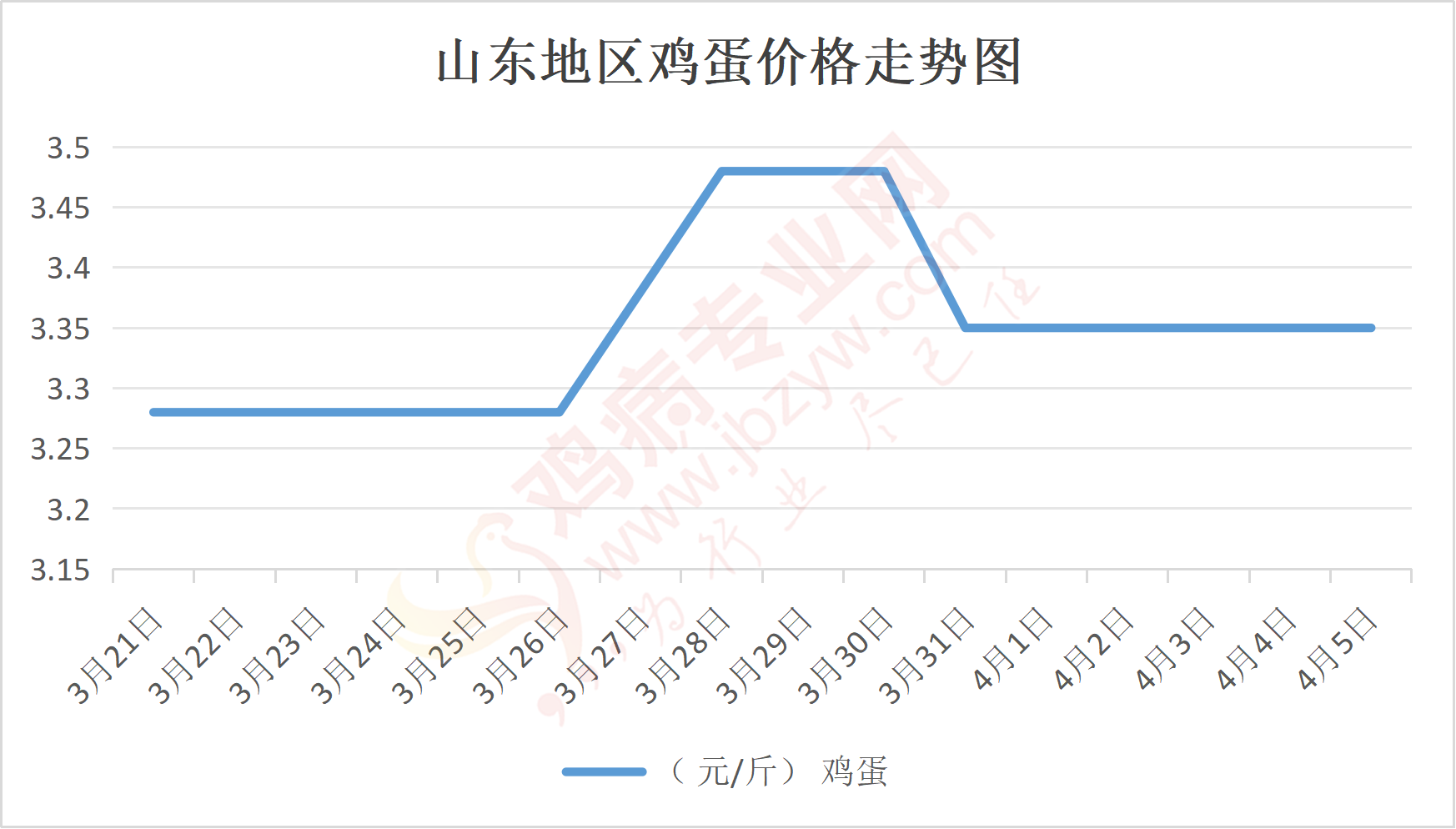 鸡病专业网消息:4月5日,山东地区莱阳鸡蛋3.35元/斤,稳;青岛鸡蛋3.35元/斤,稳;诸城鸡蛋3.4元/斤,稳;安丘鸡蛋3.25元/斤,稳;昌乐鸡蛋3.25元/斤,稳;寿光鸡蛋3.25元/斤,稳;昌邑鸡蛋3.25元/斤,稳;高密鸡蛋3.4元/斤,稳;青州鸡蛋3.25元/斤,稳;临朐鸡蛋3.25元/斤,稳;莱州鸡蛋3.35元/斤,稳;威海鸡蛋3.35元/斤,稳;临沭鸡蛋3.3元/斤,稳;沂水鸡蛋3.3元/斤,稳;沂南鸡蛋3.3元/斤,稳;莒南鸡蛋3.3元/斤,稳;兰陵县鸡蛋3.3元/斤,稳;日照鸡蛋3.3元/斤,稳;莒县鸡蛋3.3元/斤,稳;日照辛萁商贸鸡蛋3.3元/斤,稳;泗水鸡蛋价格96元/30斤,稳;济宁、汶上鸡蛋价格96元/30斤,稳;梁山、东平红蛋价格96元/30斤,稳;枣庄滕州地区鸡蛋混码主流到户98元/30斤,稳;泰安地区新泰鸡蛋价格96元/30斤,稳;菏泽地区曹县主流到户96元/30斤,稳;成武鸡蛋价格96元/30斤,稳;单县到户96元/30斤,稳;聊城莘县96元/30斤,稳;莱芜鸡蛋144元/45斤,稳;济南鸡蛋144元/45斤,稳;德州鸡蛋130元/40斤,涨;滨州鸡蛋130元/40斤,涨。