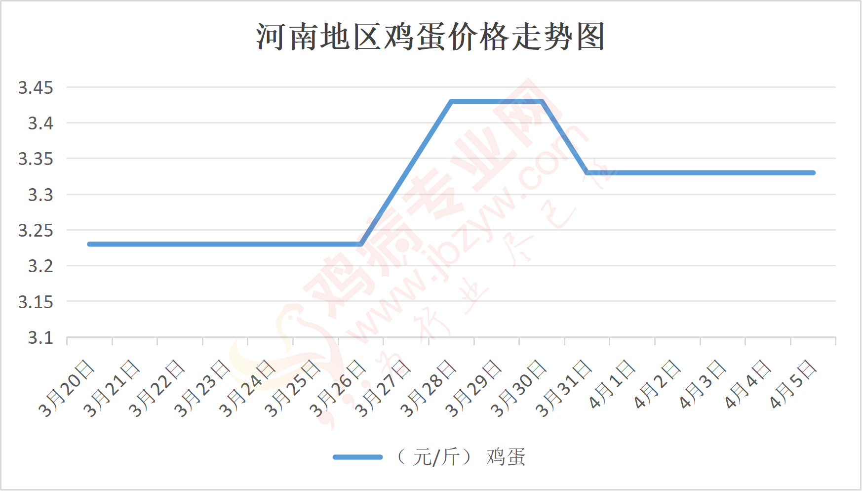 鸡病专业网消息:4月5日,河南郑州鸡蛋3.3元/斤,稳;新密鸡蛋3.3元/斤,稳;荥阳鸡蛋3.3元/斤,稳;中牟鸡蛋3.3元/斤,稳;周口鸡蛋3.25元/斤,稳;商丘鸡蛋97元/30斤,稳;鹤壁鸡蛋3.3元/斤,稳;汝州鸡蛋3.25元/斤,稳;开封鸡蛋97元/30斤,稳;漯河鸡蛋3.25元/斤,稳;漯河临颍鸡蛋3.25元/斤,稳;许昌鸡蛋3.25元/斤,稳;南阳鸡蛋3.25元/斤,稳;南阳邓州鸡蛋3.25元/斤,稳;新乡鸡蛋3.25元/斤,稳;安阳鸡蛋3.25元/斤,稳;新郑鸡蛋3.3元/斤,稳;登封鸡蛋3.3元/斤,稳;平顶山鸡蛋3.25元/斤,稳;驻马店鸡蛋3.25元/斤,稳;三门峡鸡蛋3.25元/斤,稳;焦作鸡蛋3.25元/斤,稳;信阳鸡蛋3.25元/斤,稳;濮阳鸡蛋3.25元/斤,稳。