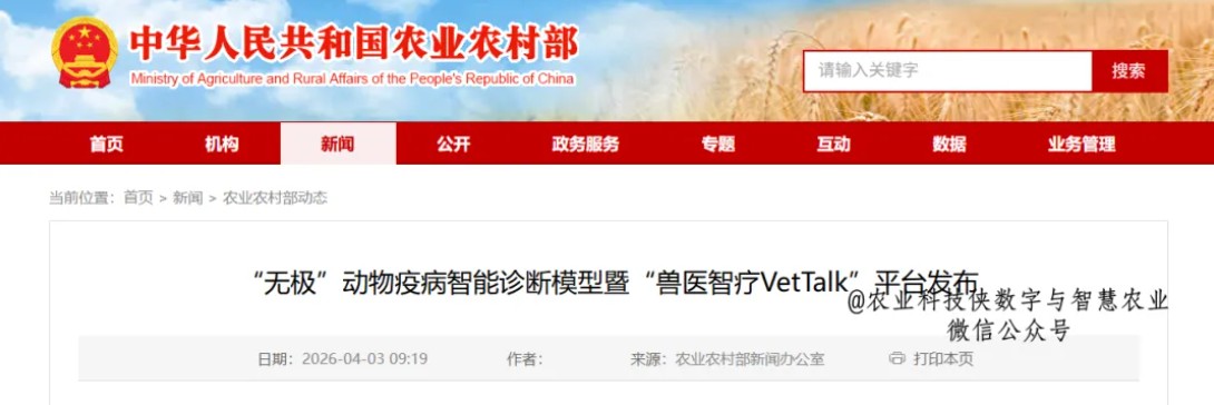 4月1日,农业农村部直属事业单位中国动物疫病预防控制中心在京发布“无极”动物疫病智能诊断模型暨“兽医智疗VetTalk”平台。农业农村部党组成员、副部长张治礼出席发布仪式并宣布平台上线。