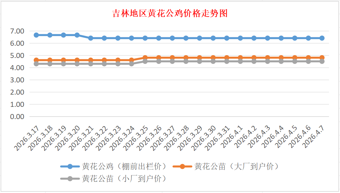 黄花公苗:价格稳定,大厂到户价4.80元/羽,小厂到户价4.50元/羽,稳。