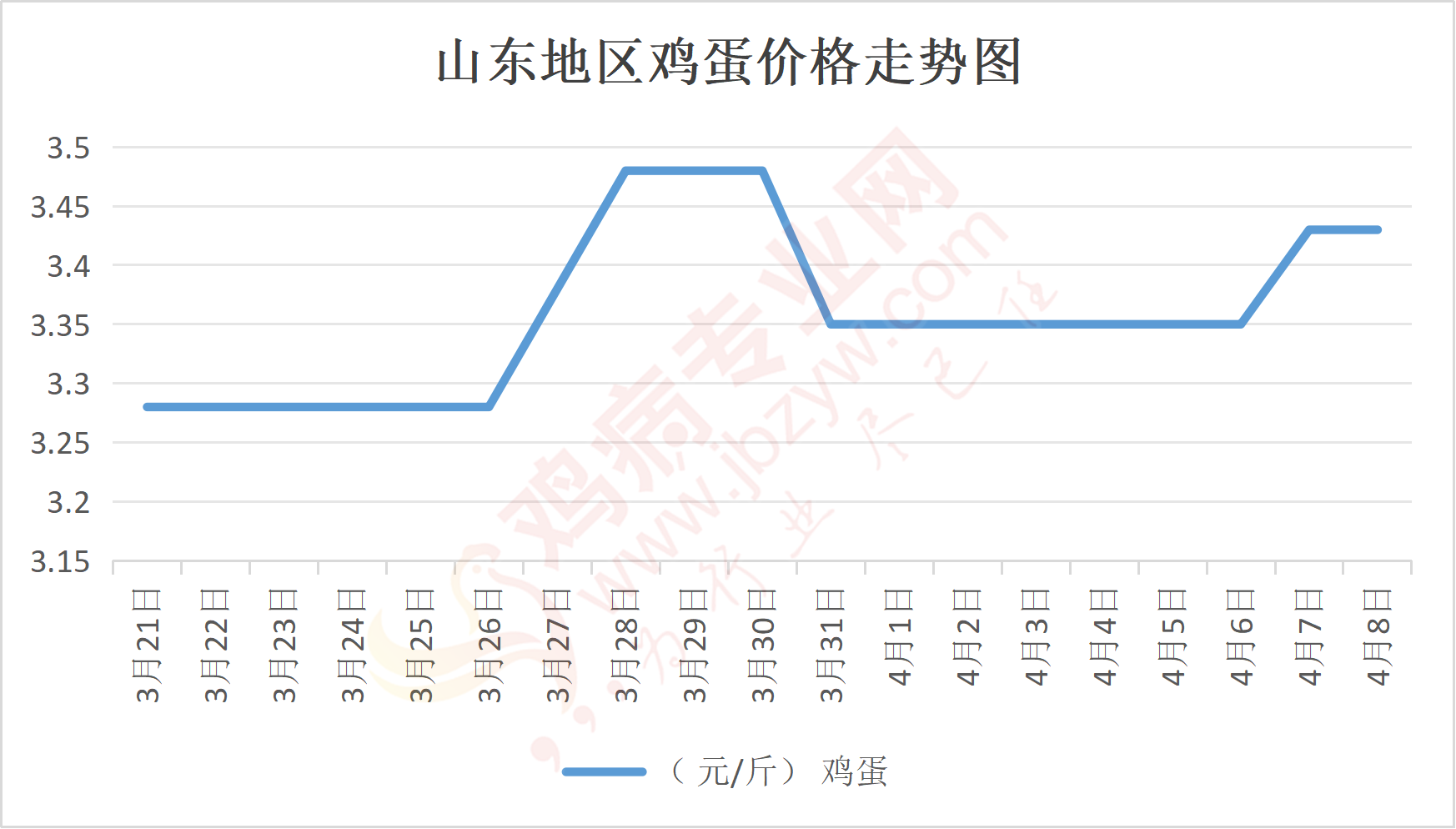 鸡病专业网消息:4月8日,山东地区莱阳鸡蛋3.5元/斤,稳;青岛鸡蛋3.5元/斤,稳;诸城鸡蛋3.45元/斤,稳;安丘鸡蛋3.35元/斤,稳;昌乐鸡蛋3.35元/斤,稳;寿光鸡蛋3.35元/斤,稳;昌邑鸡蛋3.35元/斤,稳;高密鸡蛋3.45元/斤,稳;青州鸡蛋3.35元/斤,稳;临朐鸡蛋3.35元/斤,稳;莱州鸡蛋3.5元/斤,稳;威海鸡蛋3.5元/斤,稳;临沭鸡蛋3.4元/斤,稳;沂水鸡蛋3.4元/斤,稳;沂南鸡蛋3.4元/斤,稳;莒南鸡蛋3.4元/斤,稳;兰陵县鸡蛋3.4元/斤,稳;日照鸡蛋3.4元/斤,稳;莒县鸡蛋3.4元/斤,稳;日照辛萁商贸鸡蛋3.4元/斤,稳;泗水鸡蛋价格99元/30斤,稳;济宁、汶上鸡蛋价格99元/30斤,稳;梁山、东平红蛋价格99元/30斤,稳;枣庄滕州地区鸡蛋混码主流到户100元/30斤,稳;泰安地区新泰鸡蛋价格99元/30斤,稳;菏泽地区曹县主流到户99元/30斤,稳;成武鸡蛋价格99元/30斤,稳;单县到户99元/30斤,稳;聊城莘县99元/30斤,稳;莱芜鸡蛋148元/45斤,稳;济南鸡蛋148元/45斤,稳;德州鸡蛋132元/40斤,稳;滨州鸡蛋132元/40斤,稳。