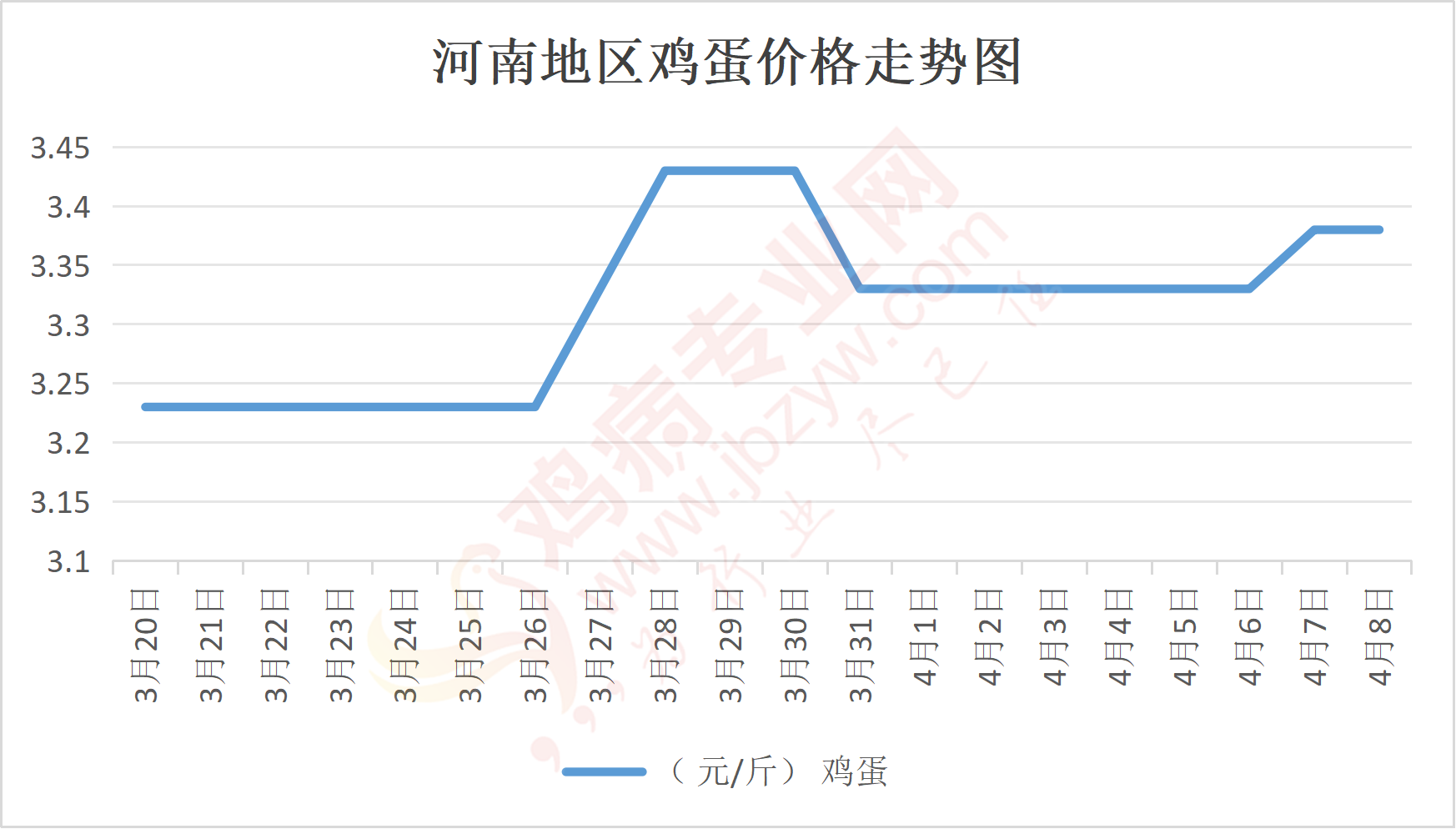鸡病专业网消息:4月8日,河南郑州鸡蛋3.4元/斤,稳;新密鸡蛋3.4元/斤,稳;荥阳鸡蛋3.4元/斤,稳;中牟鸡蛋3.4元/斤,稳;周口鸡蛋3.35元/斤,稳;商丘鸡蛋100元/30斤,稳;鹤壁鸡蛋3.4元/斤,稳;汝州鸡蛋3.35元/斤,稳;开封鸡蛋100元/30斤,稳;漯河鸡蛋3.35元/斤,稳;漯河临颍鸡蛋3.35元/斤,稳;许昌鸡蛋3.35元/斤,稳;南阳鸡蛋3.35元/斤,稳;南阳邓州鸡蛋3.35元/斤,稳;新乡鸡蛋3.35元/斤,稳;安阳鸡蛋3.35元/斤,稳;新郑鸡蛋3.4元/斤,稳;登封鸡蛋3.4元/斤,稳;平顶山鸡蛋3.35元/斤,稳;驻马店鸡蛋3.35元/斤,稳;三门峡鸡蛋3.35元/斤,稳;焦作鸡蛋3.35元/斤,稳;信阳鸡蛋3.35元/斤,稳;濮阳鸡蛋3.35元/斤,稳。