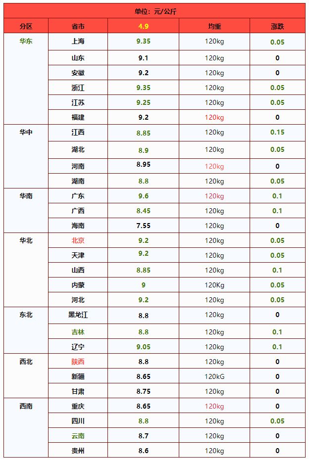 | 华中 | 河南省 | 9.02 | 8.99 | 0.34% | 元/KG |