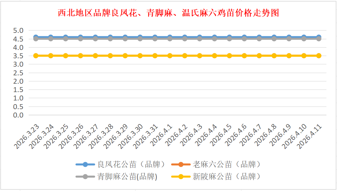 品牌新陂麻:价格稳定,到户价公苗4.50元/羽,稳。