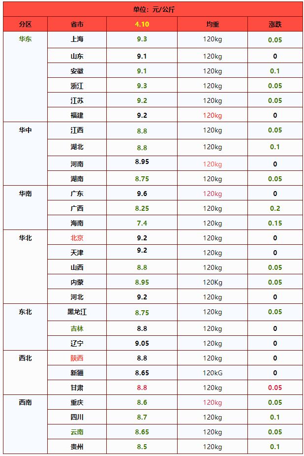 | 华北 | 北 京 | 9.28 | 9.28 | 0.00% | 元/KG |
