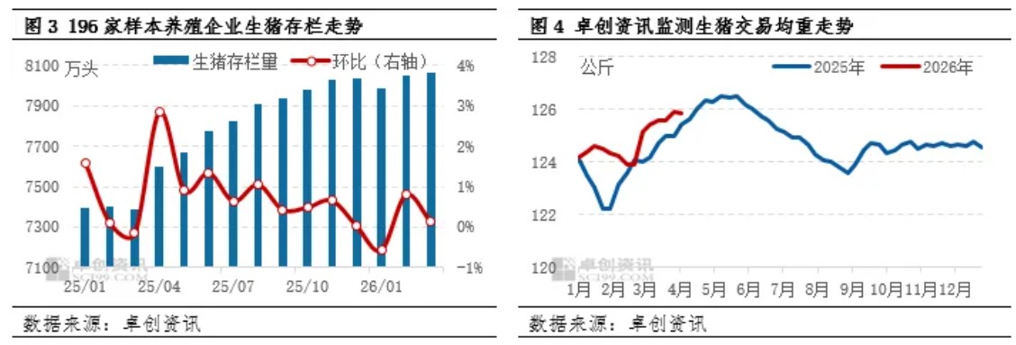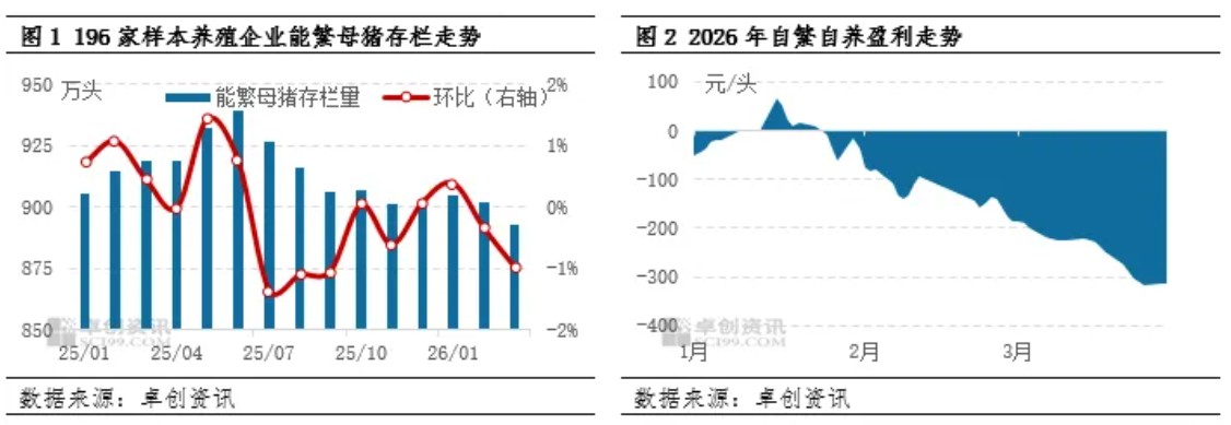 3月能繁母猪存栏环比下滑,生猪存栏环比增加,呈现阶段性分化态势。能繁母猪下滑主要受行业深度亏损与政策调控双重驱动,养殖端淘汰低效母猪;生猪存栏增加则因前期产能充裕、出栏节奏受限及被动压栏。展望4月,能繁母猪存栏或稳步下滑,生猪存栏由增转减,整体供应压力或有所缓解。