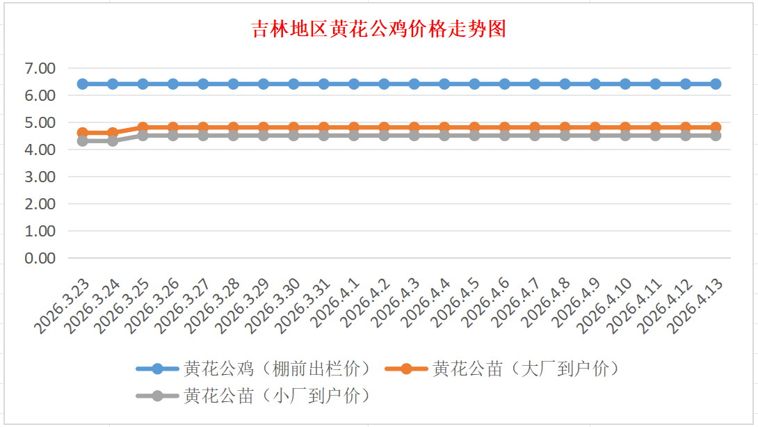 黄花公苗:价格稳定,大厂到户价4.80元/羽,小厂到户价4.50元/羽,稳。
