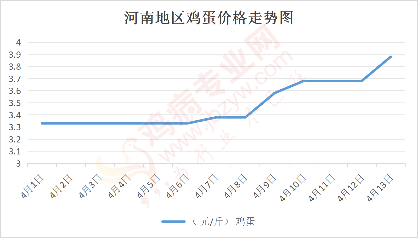 鸡病专业网消息:4月13日,河南郑州鸡蛋3.9元/斤,涨;新密鸡蛋3.9元/斤,涨;荥阳鸡蛋3.9元/斤,涨;中牟鸡蛋3.9元/斤,涨;周口鸡蛋3.85元/斤,涨;商丘鸡蛋115元/30斤,涨;鹤壁鸡蛋3.9元/斤,涨;汝州鸡蛋3.85元/斤,涨;开封鸡蛋115元/30斤,涨;漯河鸡蛋3.85元/斤,涨;漯河临颍鸡蛋3.85元/斤,涨;许昌鸡蛋3.85元/斤,涨;南阳鸡蛋3.85元/斤,涨;南阳邓州鸡蛋3.85元/斤,涨;新乡鸡蛋3.85元/斤,涨;安阳鸡蛋3.85元/斤,涨;新郑鸡蛋3.9元/斤,涨;登封鸡蛋3.9元/斤,涨;平顶山鸡蛋3.85元/斤,涨;驻马店鸡蛋3.85元/斤,涨;三门峡鸡蛋3.85元/斤,涨;焦作鸡蛋3.85元/斤,涨;信阳鸡蛋3.85元/斤,涨;濮阳鸡蛋3.85元/斤,涨。