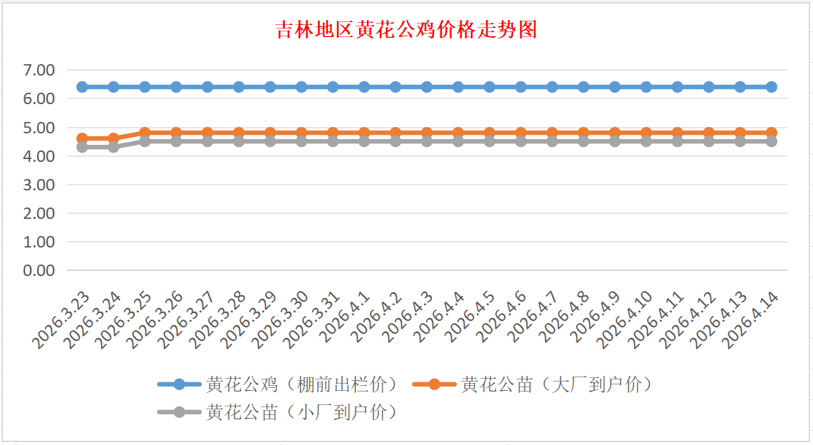 黄花公苗:价格稳定,大厂到户价4.80元/羽,小厂到户价4.50元/羽,稳。