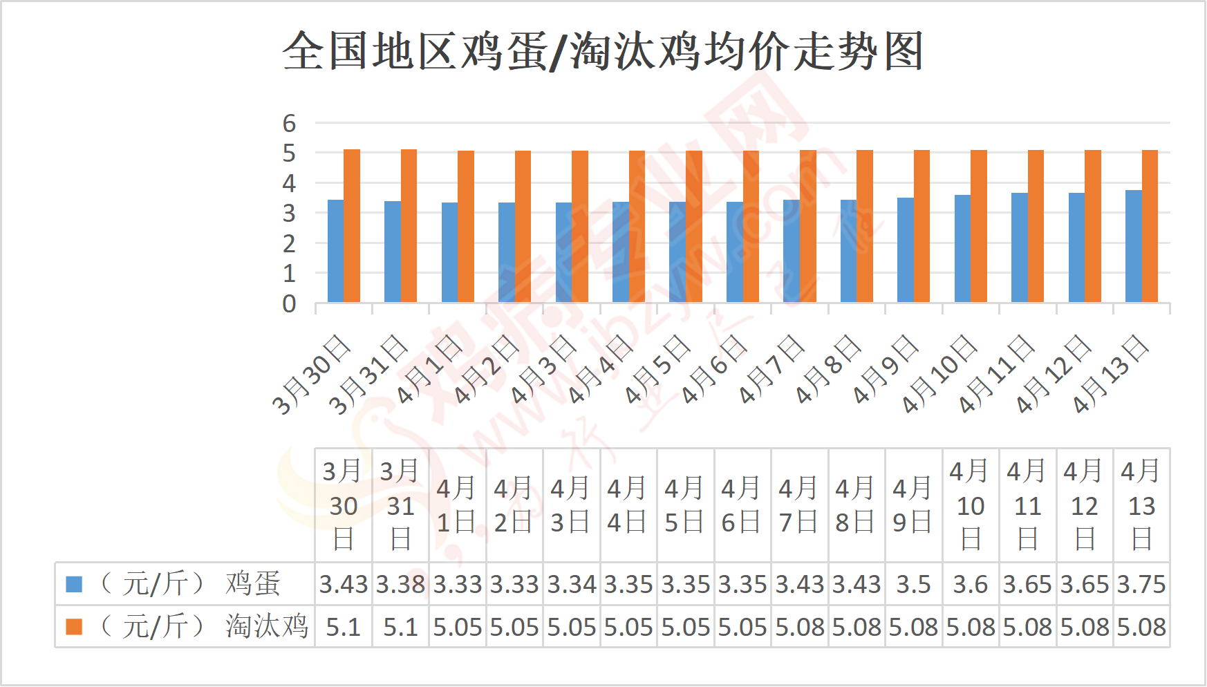 河南地区:南阳鸡蛋3.85元/斤,与昨日相比涨,淘汰鸡5.3元/斤;