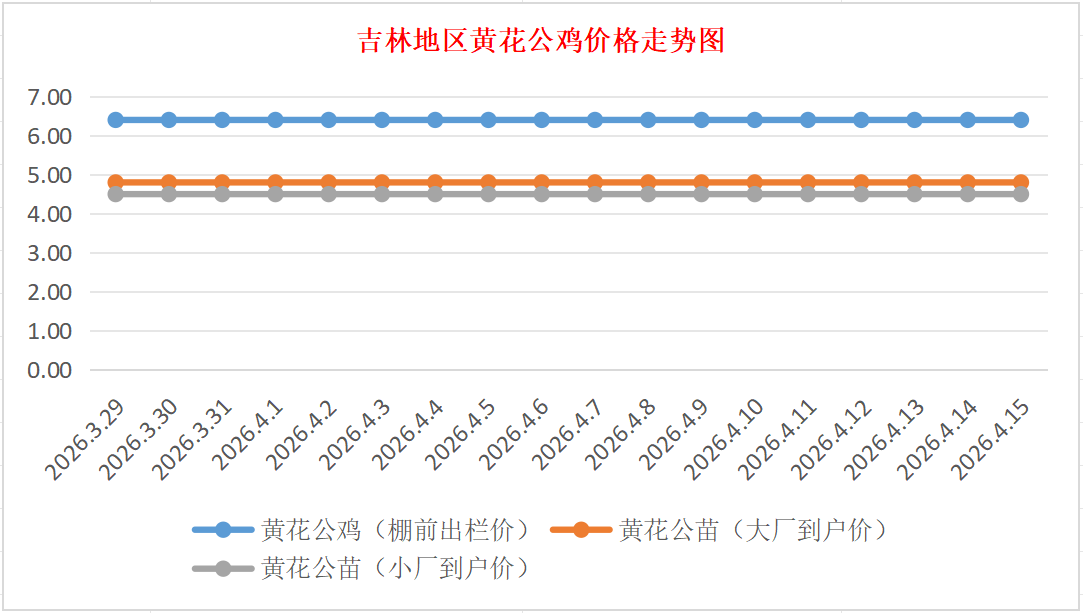 黄花公苗:价格稳定,大厂到户价4.80元/羽,小厂到户价4.50元/羽,稳。