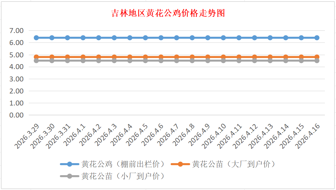 黄花公苗:价格稳定,大厂到户价4.80元/羽,小厂到户价4.50元/羽,稳。