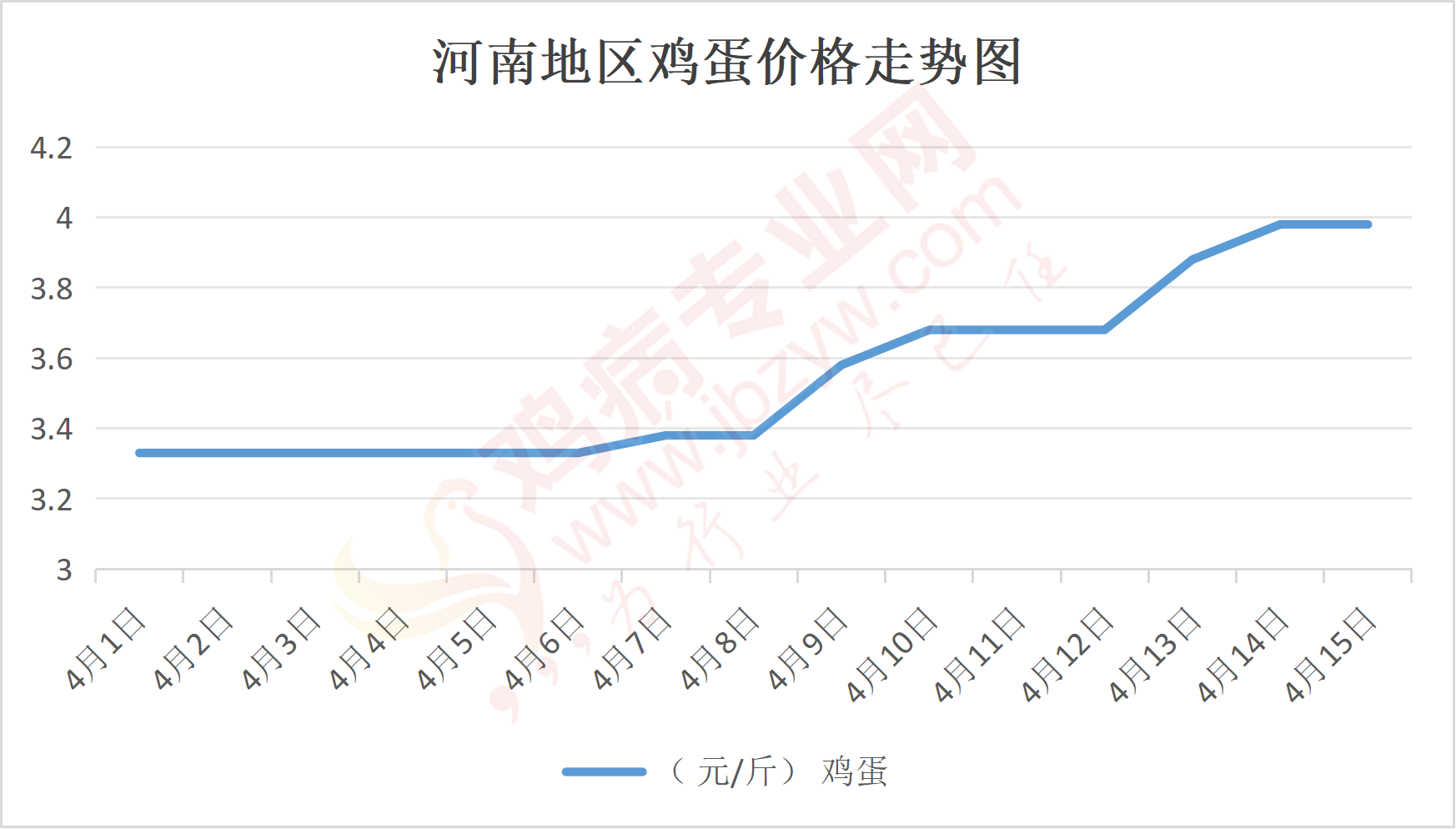 鸡病专业网消息:4月15日,河南郑州鸡蛋3.9元/斤,稳;新密鸡蛋3.9元/斤,稳;荥阳鸡蛋3.9元/斤,稳;中牟鸡蛋3.9元/斤,稳;周口鸡蛋3.85元/斤,稳;商丘鸡蛋118元/30斤,稳;鹤壁鸡蛋3.9元/斤,稳;汝州鸡蛋3.85元/斤,稳;开封鸡蛋118元/30斤,稳;漯河鸡蛋3.85元/斤,稳;漯河临颍鸡蛋3.85元/斤,稳;许昌鸡蛋3.85元/斤,稳;南阳鸡蛋3.85元/斤,稳;南阳邓州鸡蛋3.85元/斤,稳;新乡鸡蛋3.85元/斤,稳;安阳鸡蛋3.85元/斤,稳;新郑鸡蛋3.9元/斤,稳;登封鸡蛋3.9元/斤,稳;平顶山鸡蛋3.85元/斤,稳;驻马店鸡蛋3.85元/斤,稳;三门峡鸡蛋3.85元/斤,稳;焦作鸡蛋3.85元/斤,稳;信阳鸡蛋3.85元/斤,稳;濮阳鸡蛋3.85元/斤,稳。