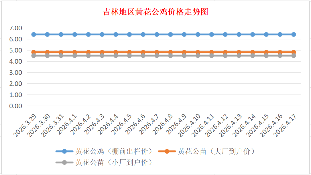 黄花公苗:价格稳定,大厂到户价4.80元/羽,小厂到户价4.50元/羽,稳。