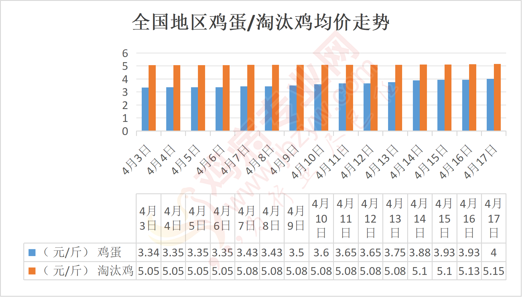 河南地区:南阳鸡蛋4.05元/斤,与昨日相比涨,淘汰鸡5.3元/斤;