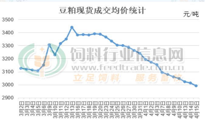 据统计数据显示,本周以来虽然油厂豆粕销售较好,但主要以远期合同为主,豆粕现货价格处于持续下行的趋势,目前已经失守于3000元/吨的重要关口,跌至2990元/吨,较3月下旬高点下跌超400元/吨。华东、山东及华南等地的市场价格已经跌破2900元/吨,只有东北、西北及西南等地区仍能维持在3100元/吨左右的高价,其他的华中等地基本维持在3000元/吨。预计随着后期豆粕产量继续增加,在油厂仍有一定压榨利润的情况下,预计豆粕价格仍有一定的下跌空间。
