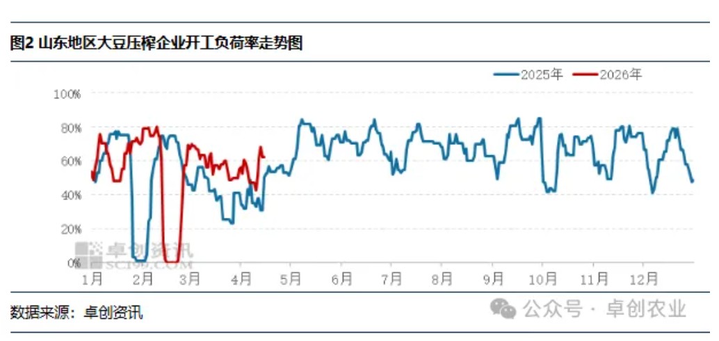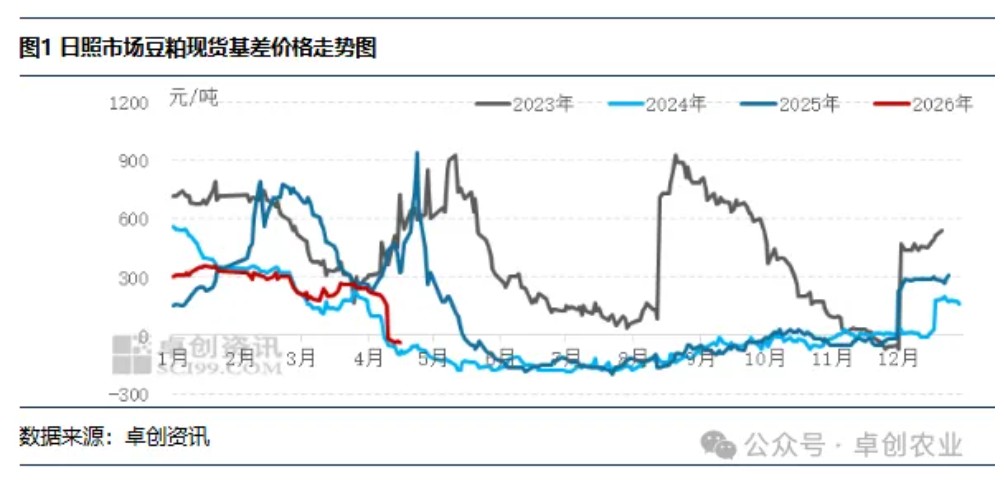 【导语】 4月山东豆粕市场整体呈现供需双弱格局,期现回归逻辑持续兑现,现货基差自高位显著收窄。供应端虽因原料衔接不畅导致压榨开工处于年内低位,但市场对此已充分计价,提振作用有限;需求端受生猪养殖深度亏损拖累,部分饲料企业豆粕添加比例下降,下游以消化头寸为主,叠加贸易商杀价出货,接货情绪低迷。卓创资讯预计短期山东豆粕现货基差仍以弱势运行为主,仍有下行空间。