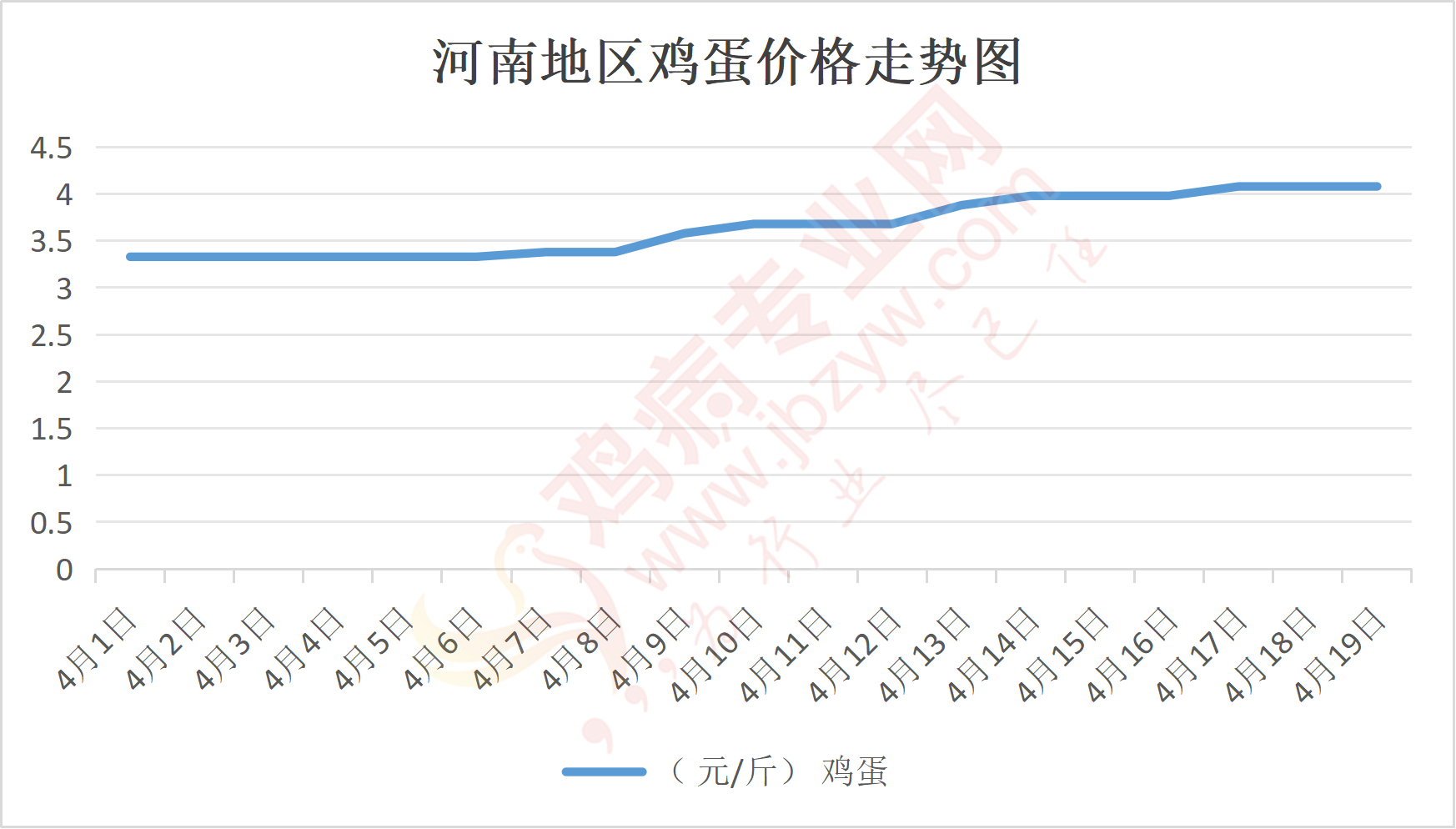 鸡病专业网消息:4月19日,河南郑州鸡蛋4.1元/斤,稳;新密鸡蛋4.1元/斤,稳;荥阳鸡蛋4.1元/斤,稳;中牟鸡蛋4.1元/斤,稳;周口鸡蛋4.05元/斤,稳;商丘鸡蛋122元/30斤,稳;鹤壁鸡蛋4.1元/斤,稳;汝州鸡蛋4.05元/斤,稳;开封鸡蛋122元/30斤,稳;漯河鸡蛋4.05元/斤,稳;漯河临颍鸡蛋4.05元/斤,稳;许昌鸡蛋4.05元/斤,稳;南阳鸡蛋4.05元/斤,稳;南阳邓州鸡蛋4.05元/斤,稳;新乡鸡蛋4.05元/斤,稳;安阳鸡蛋4.05元/斤,稳;新郑鸡蛋4.1元/斤,稳;登封鸡蛋4.1元/斤,稳;平顶山鸡蛋4.05元/斤,稳;驻马店鸡蛋4.05元/斤,稳;三门峡鸡蛋4.05元/斤,稳;焦作鸡蛋4.05元/斤,稳;信阳鸡蛋4.05元/斤,稳;濮阳鸡蛋4.05元/斤,稳。