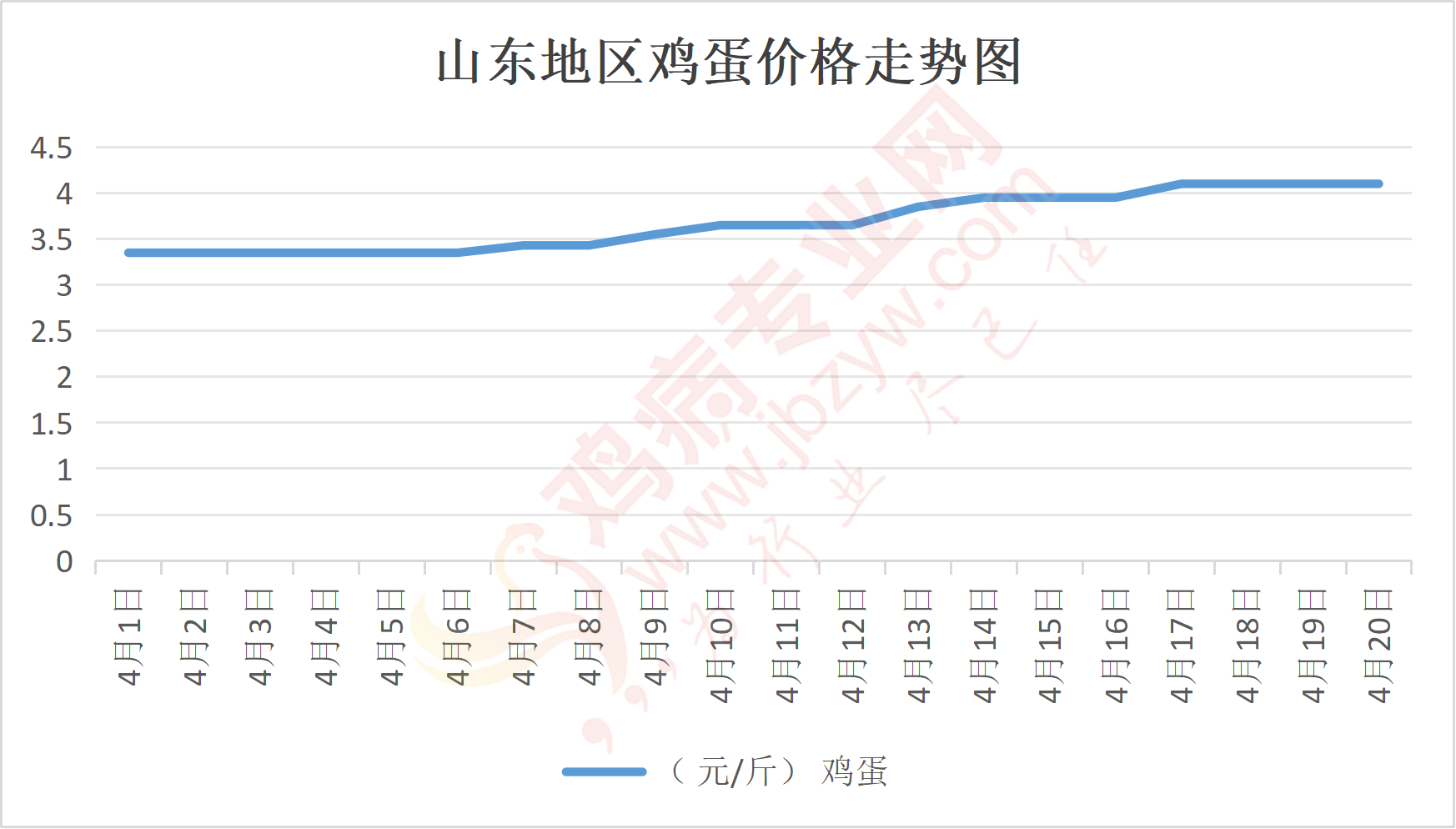 鸡病专业网消息:4月20日,山东地区莱阳鸡蛋4.1元/斤,稳;青岛鸡蛋4.1元/斤,稳;诸城鸡蛋4.15元/斤,稳;安丘鸡蛋4.1元/斤,稳;昌乐鸡蛋4.1元/斤,稳;寿光鸡蛋4.1元/斤,稳;昌邑鸡蛋4.1元/斤,稳;高密鸡蛋4.15元/斤,稳;青州鸡蛋4.1元/斤,稳;临朐鸡蛋4.1元/斤,稳;莱州鸡蛋4.1元/斤,稳;威海鸡蛋4.1元/斤,稳;临沭鸡蛋4.05元/斤,稳;沂水鸡蛋4.05元/斤,稳;沂南鸡蛋4.05元/斤,稳;莒南鸡蛋4.05元/斤,稳;兰陵县鸡蛋4.05元/斤,稳;日照鸡蛋4.05元/斤,稳;莒县鸡蛋4.05元/斤,稳;日照辛萁商贸鸡蛋4.05元/斤,稳;泗水鸡蛋价格121元/30斤,稳;济宁、汶上鸡蛋价格121元/30斤,稳;梁山、东平红蛋价格121元/30斤,稳;枣庄滕州地区鸡蛋混码主流到户122元/30斤,稳;泰安地区新泰鸡蛋价格121元/30斤,稳;菏泽地区曹县主流到户121元/30斤,稳;成武鸡蛋价格121元/30斤,稳;单县到户121元/30斤,稳;聊城莘县121元/30斤,稳;莱芜鸡蛋182元/45斤,稳;济南鸡蛋182元/45斤,稳;德州鸡蛋160元/40斤,稳;滨州鸡蛋160元/40斤,稳。