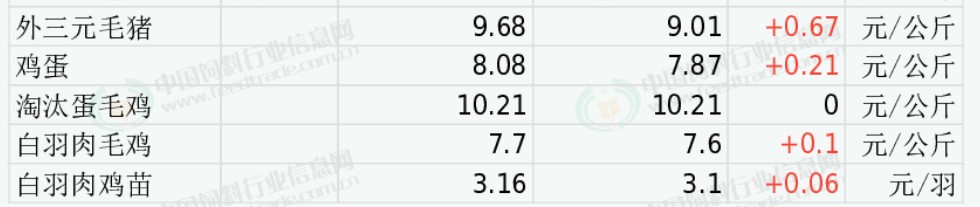 白羽肉毛鸡价格上涨。五一节前屠宰企业集中备货、祖代种源不足导致商品苗紧缺以及养殖端挺价支撑白羽肉鸡价格,不过终端消费偏弱、冻品库存偏高制约上涨空间,预计节前肉鸡行情震荡偏强。今日主产区山东白羽肉毛鸡均价7.39元/公斤,较昨日价格上涨0.10;辽宁均价7.92元/公斤,较昨日价格上涨0.10;主销区江苏均价8.38元/公斤,较昨日价格上涨0.08。