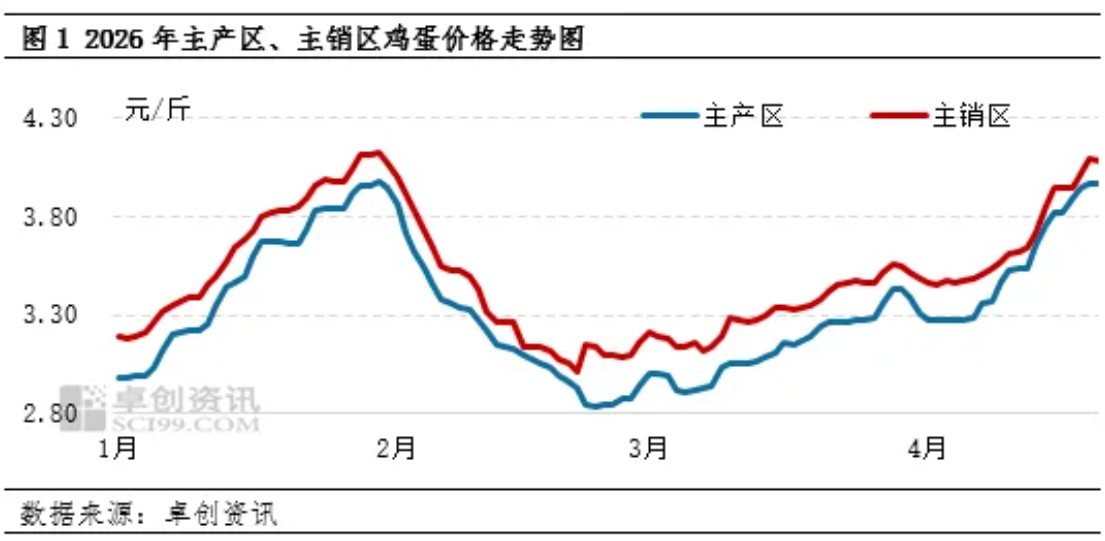 进入4月以来,鸡蛋市场价格告别前期的低迷格局,开启一轮持续性上行通道。上旬,价格温和起步,随后涨势逐步加快,中旬呈现明显的强势拉升态势。截至4月20日,全国主产区鸡蛋均价涨至3.98元/斤,较月初涨幅达到了21.34%。本轮上涨节奏紧凑、幅度可观,市场情绪由观望转向积极,养殖端议价能力增强,贸易环节拿货成本不断抬升。整体来看,4月中上旬鸡蛋价格完成了一次从底部企稳到加速冲高的完整演绎,为下旬市场运行埋下了高位调整的伏笔。