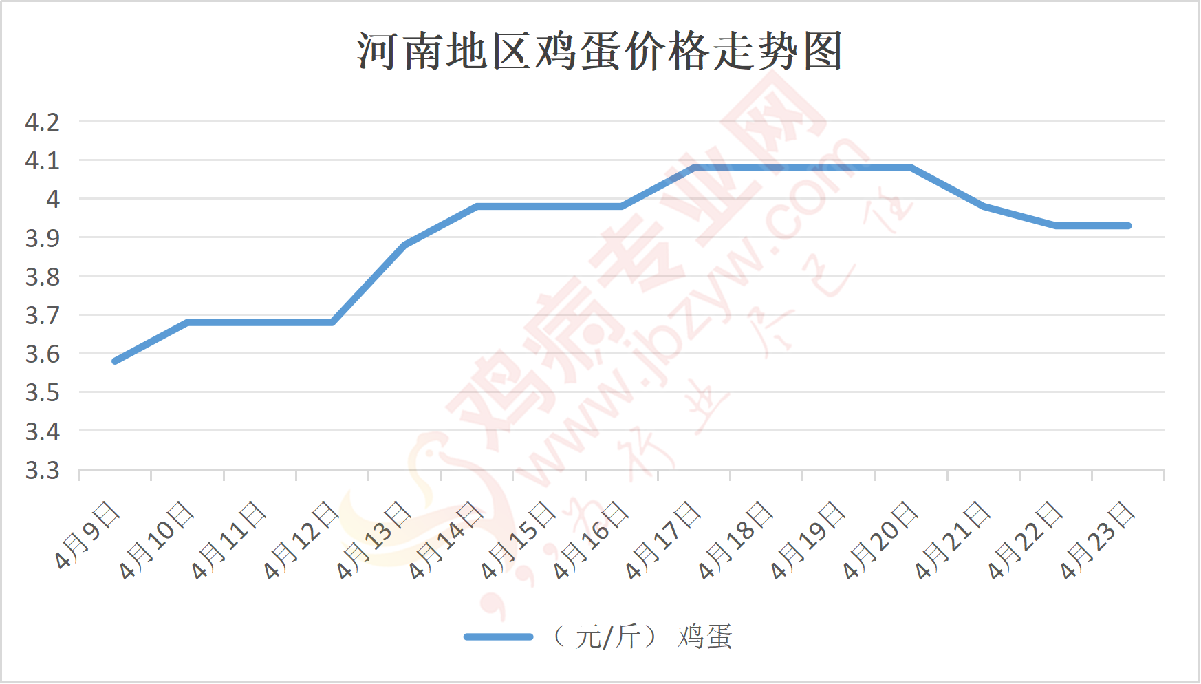 鸡病专业网消息:4月23日,河南郑州鸡蛋3.95元/斤,稳;新密鸡蛋3.95元/斤,稳;荥阳鸡蛋3.95元/斤,稳;中牟鸡蛋3.95元/斤,稳;周口鸡蛋3.9元/斤,稳;商丘鸡蛋117元/30斤,稳;鹤壁鸡蛋3.95元/斤,稳;汝州鸡蛋3.9元/斤,稳;开封鸡蛋117元/30斤,稳;漯河鸡蛋3.9元/斤,稳;漯河临颍鸡蛋3.9元/斤,稳;许昌鸡蛋3.9元/斤,稳;南阳鸡蛋3.9元/斤,稳;南阳邓州鸡蛋3.9元/斤,稳;新乡鸡蛋3.9元/斤,稳;安阳鸡蛋3.9元/斤,稳;新郑鸡蛋3.95元/斤,稳;登封鸡蛋3.95元/斤,稳;平顶山鸡蛋3.9元/斤,稳;驻马店鸡蛋3.9元/斤,稳;三门峡鸡蛋3.9元/斤,稳;焦作鸡蛋3.9元/斤,稳;信阳鸡蛋3.9元/斤,稳;濮阳鸡蛋3.9元/斤,稳。