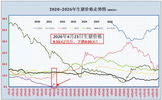 受屠宰场调整收猪结算价,预计,4月23日,外三元瘦肉型标猪价格出栏均价在9.53元/公斤,猪价下降0.05元,后市关注购销节奏的变化,关注我了解最新猪价变化!