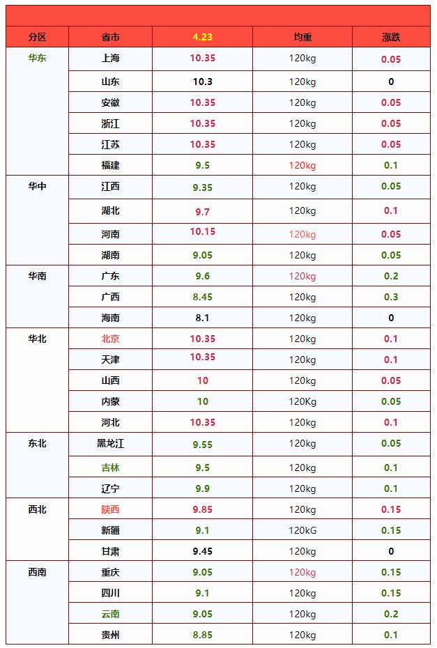 | 浙江省 | 10.46 | 10.48 | -0.19% | 元/KG | |