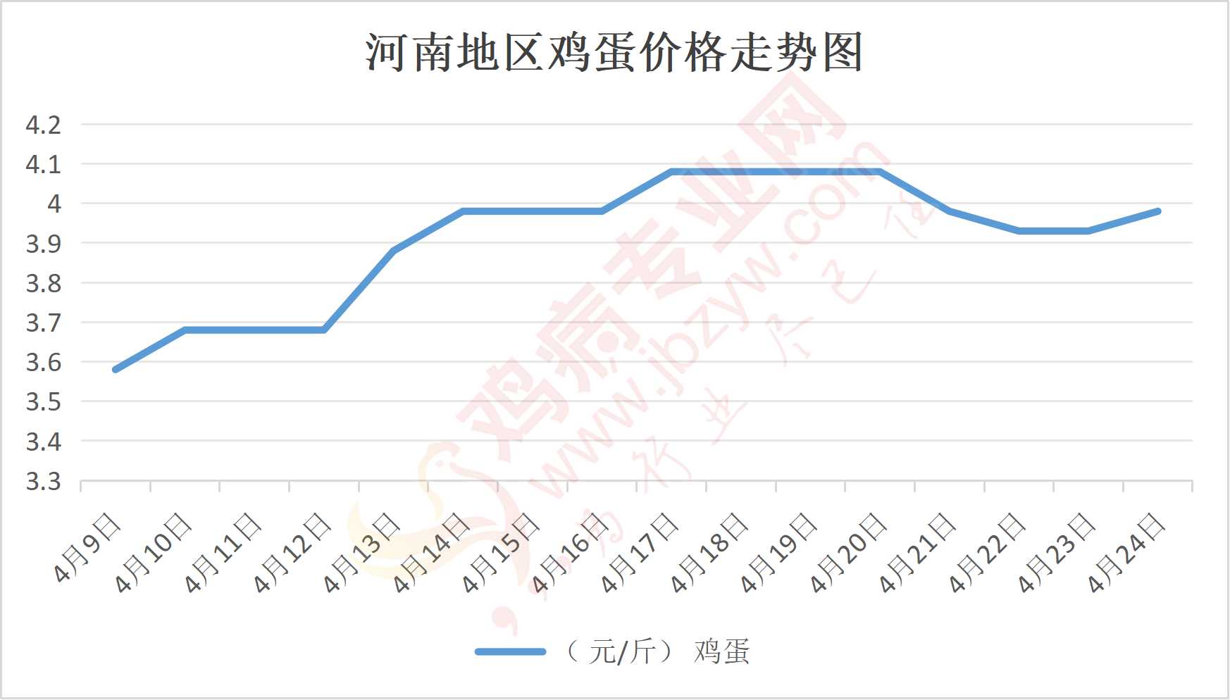 鸡病专业网消息:4月24日,河南郑州鸡蛋4元/斤,涨;新密鸡蛋4元/斤,涨;荥阳鸡蛋4元/斤,涨;中牟鸡蛋4元/斤,涨;周口鸡蛋3.95元/斤,涨;商丘鸡蛋119元/30斤,涨;鹤壁鸡蛋4元/斤,涨;汝州鸡蛋3.95元/斤,涨;开封鸡蛋119元/30斤,涨;漯河鸡蛋3.95元/斤,涨;漯河临颍鸡蛋3.95元/斤,涨;许昌鸡蛋3.95元/斤,涨;南阳鸡蛋3.95元/斤,涨;南阳邓州鸡蛋3.95元/斤,涨;新乡鸡蛋3.95元/斤,涨;安阳鸡蛋3.95元/斤,涨;新郑鸡蛋4元/斤,涨;登封鸡蛋4元/斤,涨;平顶山鸡蛋3.95元/斤,涨;驻马店鸡蛋3.95元/斤,涨;三门峡鸡蛋3.95元/斤,涨;焦作鸡蛋3.95元/斤,涨;信阳鸡蛋3.95元/斤,涨;濮阳鸡蛋3.95元/斤,涨。
