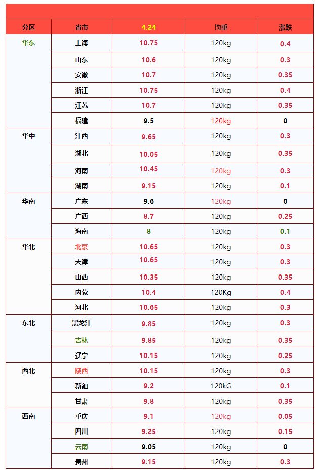 | 河北省 | 10.48 | 10.23 | 2.41% | 元/KG | |