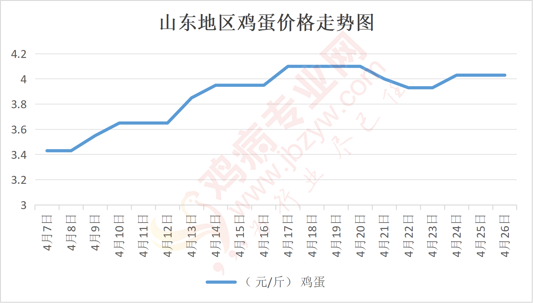 鸡病专业网消息:4月26日,山东地区莱阳鸡蛋4.05元/斤,稳;青岛鸡蛋4.05元/斤,稳;诸城鸡蛋4元/斤,稳;安丘鸡蛋4元/斤,稳;昌乐鸡蛋4元/斤,稳;寿光鸡蛋4元/斤,稳;昌邑鸡蛋4元/斤,稳;高密鸡蛋4元/斤,稳;青州鸡蛋4元/斤,稳;临朐鸡蛋4元/斤,稳;莱州鸡蛋4.05元/斤,稳;威海鸡蛋4.05元/斤,稳;临沭鸡蛋4元/斤,稳;沂水鸡蛋4元/斤,稳;沂南鸡蛋4元/斤,稳;莒南鸡蛋4元/斤,稳;兰陵县鸡蛋4元/斤,稳;日照鸡蛋4元/斤,稳;莒县鸡蛋4元/斤,稳;日照辛萁商贸鸡蛋4元/斤,稳;泗水鸡蛋价格118元/30斤,稳;济宁、汶上鸡蛋价格118元/30斤,稳;梁山、东平红蛋价格118元/30斤,稳;枣庄滕州地区鸡蛋混码主流到户120元/30斤,稳;泰安地区新泰鸡蛋价格118元/30斤,稳;菏泽地区曹县主流到户118元/30斤,稳;成武鸡蛋价格118元/30斤,稳;单县到户118元/30斤,稳;聊城莘县118元/30斤,稳;莱芜鸡蛋177元/45斤,稳;济南鸡蛋177元/45斤,稳;德州鸡蛋156元/40斤,稳;滨州鸡蛋156元/40斤,稳。