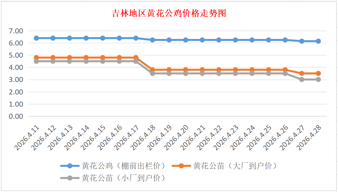 黄花公苗:价格稳定,大厂到户价3.50元/羽,小厂到户价3.00元/羽,稳。