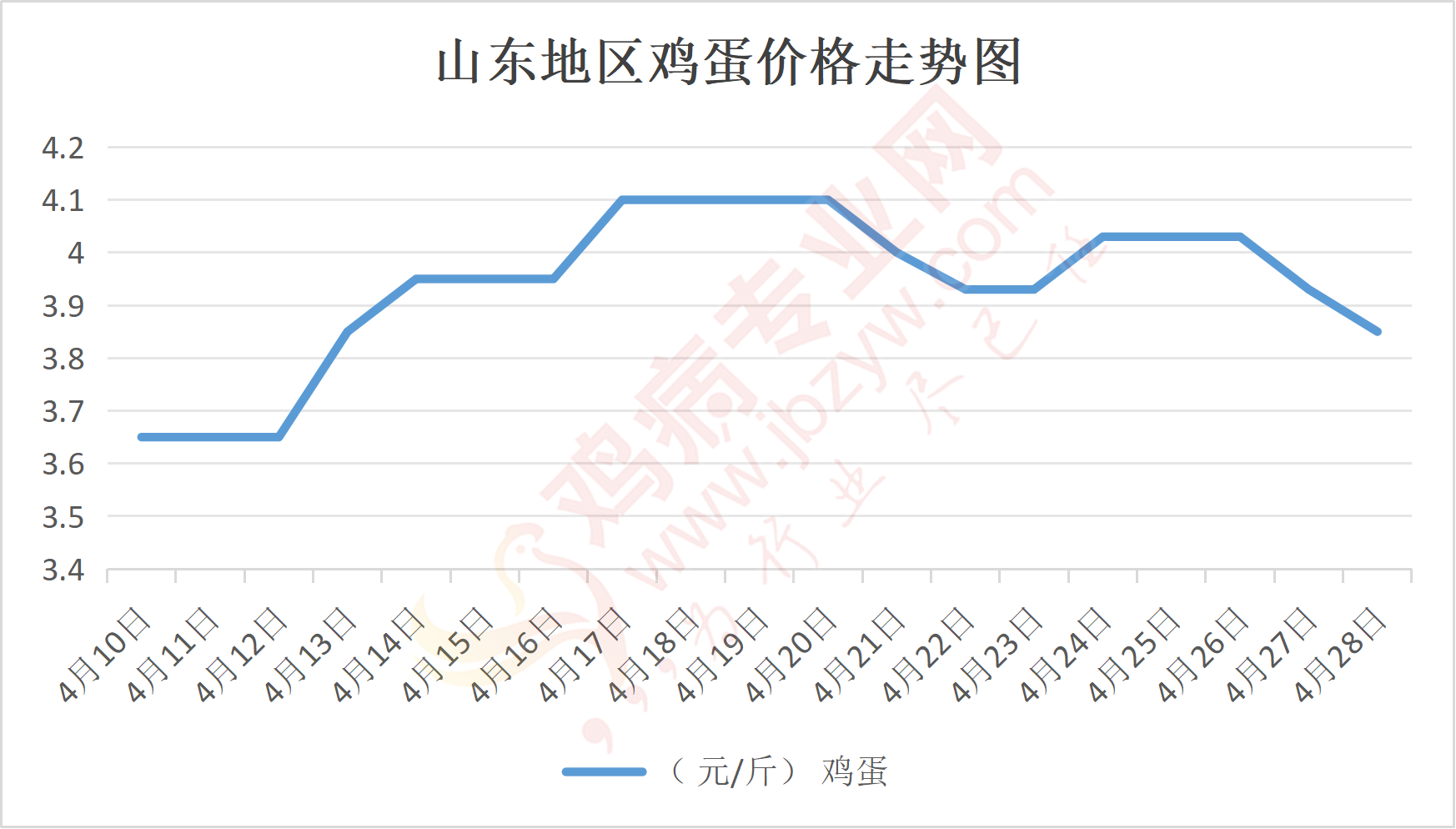 鸡病专业网消息:4月28日,山东地区莱阳鸡蛋3.9元/斤,落;青岛鸡蛋3.9元/斤,落;诸城鸡蛋3.9元/斤,落;安丘鸡蛋3.8元/斤,落;昌乐鸡蛋3.8元/斤,落;寿光鸡蛋3.8元/斤,落;昌邑鸡蛋3.8元/斤,落;高密鸡蛋3.9元/斤,落;青州鸡蛋3.8元/斤,落;临朐鸡蛋3.8元/斤,落;莱州鸡蛋3.9元/斤,落;威海鸡蛋3.9元/斤,落;临沭鸡蛋3.8元/斤,落;沂水鸡蛋3.8元/斤,落;沂南鸡蛋3.8元/斤,落;莒南鸡蛋3.8元/斤,落;兰陵县鸡蛋3.8元/斤,落;日照鸡蛋3.8元/斤,落;莒县鸡蛋3.8元/斤,落;日照辛萁商贸鸡蛋3.8元/斤,落;泗水鸡蛋价格114元/30斤,落;济宁、汶上鸡蛋价格114元/30斤,落;梁山、东平红蛋价格114元/30斤,落;枣庄滕州地区鸡蛋混码主流到户116元/30斤,落;泰安地区新泰鸡蛋价格114元/30斤,落;菏泽地区曹县主流到户114元/30斤,落;成武鸡蛋价格114元/30斤,落;单县到户114元/30斤,落;聊城莘县114元/30斤,落;莱芜鸡蛋170元/45斤,落;济南鸡蛋170元/45斤,落;德州鸡蛋150元/40斤,落;滨州鸡蛋150元/40斤,落。