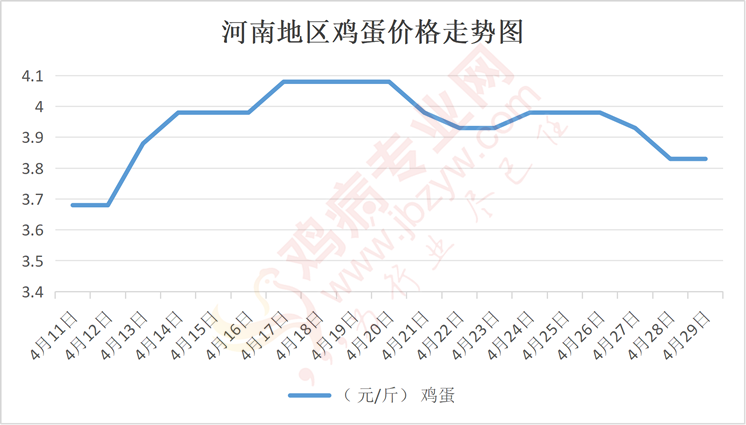鸡病专业网消息:4月29日,河南郑州鸡蛋3.85元/斤,稳;新密鸡蛋3.85元/斤,稳;荥阳鸡蛋3.85元/斤,稳;中牟鸡蛋3.85元/斤,稳;周口鸡蛋3.8元/斤,稳;商丘鸡蛋114元/30斤,稳;鹤壁鸡蛋3.85元/斤,稳;汝州鸡蛋3.8元/斤,稳;开封鸡蛋115-116元/30斤,稳;漯河鸡蛋3.8元/斤,稳;漯河临颍鸡蛋3.8元/斤,稳;许昌鸡蛋3.8元/斤,稳;南阳鸡蛋3.8元/斤,稳;南阳邓州鸡蛋3.8元/斤,稳;新乡鸡蛋3.8元/斤,稳;安阳鸡蛋3.8元/斤,稳;新郑鸡蛋3.85元/斤,稳;登封鸡蛋3.85元/斤,稳;平顶山鸡蛋3.8元/斤,稳;驻马店鸡蛋3.8元/斤,稳;三门峡鸡蛋3.8元/斤,稳;焦作鸡蛋3.8元/斤,稳;信阳鸡蛋3.8元/斤,稳;濮阳鸡蛋3.8元/斤,稳。